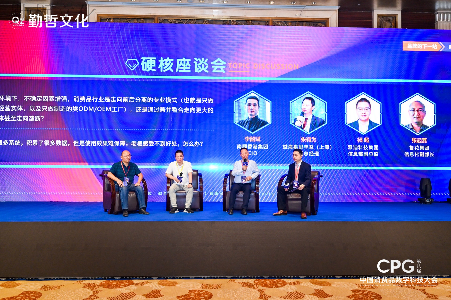 9月23日上午的“硬核座谈会(一)”环节由南顺香港集团CIO李韶斌、益海嘉里(丰益)副总经理朱有为、雅迪科技集团信息化副总监杨超以及鲁花集团信息化副部长张起嘉就消费品行业的营销经营实体、ODM\OEM工厂以及企业数字化提质增效等问题展开精彩讨论,为大家留下了宝贵的意见。